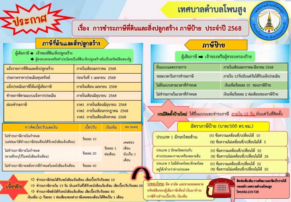 ประชาสัมพันธ์ การชำระภาษีที่ดินและสิ่งปลูกสร้าง ภาษีป้าย ประจำปี 2568[30 กรกฎาคม 2568]