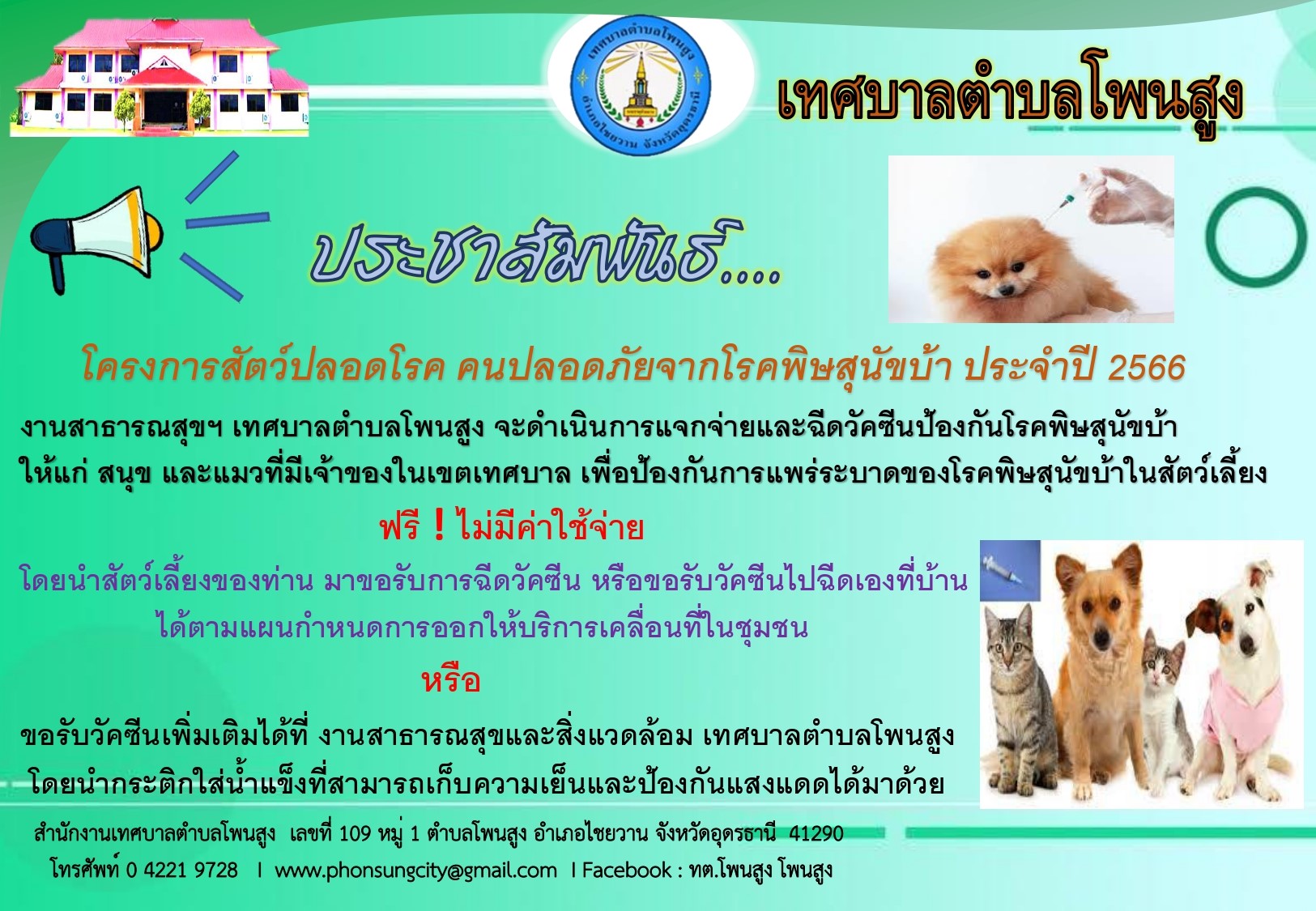 ชื่อเรื่อง : ขอเชิญร่วมโครงการสัตว์ปลอดโรค คนปลอดภัยจากโรคพิษสุนัขบ้า ประจำปี 2566 งานสาธารณสุขฯ เทศบาลตำบลโพนสูง จะดำเนินการแจกจ่ายและฉีดวัคซีนป้องกันโรคพิษสุนัขบ้า ให้แก่ สนุข และแมวที่มีเจ้าของในเขตเทศบาล เพื่อป้องกันการแพร่ระบาดของโรคพิษสุนัขบ้าในสัตว์เลี้ยง ฟรี ! ไม่มีค่าใช้จ่าย